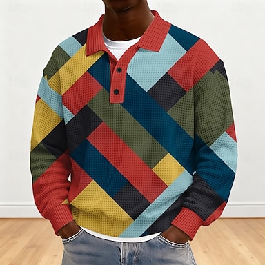 Herren Farbblock Geometrisch Waffel-Poloshirts Langarm Polo-Shirts Revers Sportbekleidung Lässig Schule Athleisure Alltagskleidung 3D-Druck Frühling Herbst Winter Blau Rote Orange