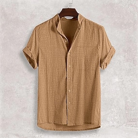 Herren leinenhemd Hemd mit Stehkragen Lässiges Hemd Glatt Urlaub Festtage Schwarz Weiß Gelb Rosa Kurzarm Stehkragen Frühling Sommer Bekleidung Vordertasche