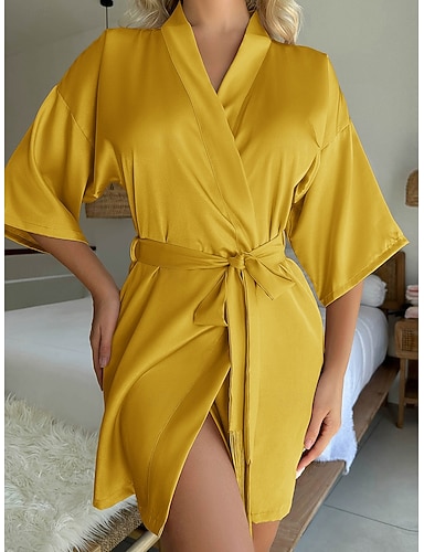 Damen Freizeitkleidung Robe Nachthemd Mode Lässig Einfarbig Satin-Seidenpyjamas Patchwork Kleid Täglich Heim Urlaub Langarm V Ausschnitt Schwarz Champagner Gelb Rosa Kamel Sommer Frühling Lässiger