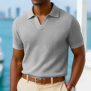 Herren Waffel-Poloshirts Poloshirts Urlaub Lässig V Ausschnitt Gerippter Polokragen Kurzarm Mode Basic Einfach Texture Knöpfe Weich Sommer Frühling Normale Passform Kamel Schwarz Weiß Blau Grün Grau
