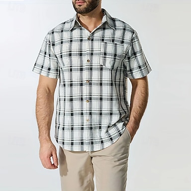 Herren Hemd Sommerhemd Freizeithemd Strandhemd Knopfhemd Gelb Grau Kurzarm Karomuster Revers Urlaub Hawaiianisch Tasche Bekleidung Polyester Mode Lässig Bequem