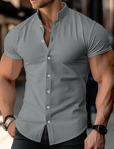 Herren Hemd Leinenhemd Sommerhemd Strandbekleidung Stehkragenhemd Knopfhemd Einfach Urlaub Lässig Schwarz Weiß Blau Khaki Kurzarm Stehkragen Sommer Bekleidung