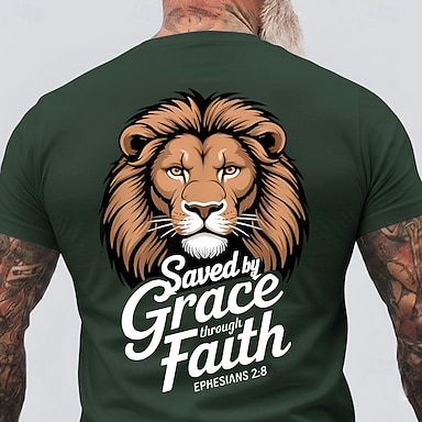 Herren-T-Shirt mit Löwenkopf-Motiv „Errettung durch Gnade und Glauben“ (Epheser 2,8). Christliches, religiöses und inspirierendes Motiv. Normale Passform. Alltagstauglich. Designer-Kleidung. Größen: