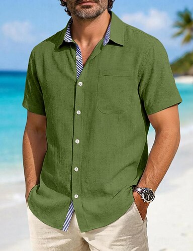 Herren Hemd Leinenhemd Knopfhemd Einfach Lässig Urlaub Schwarz Weiß Grün Khaki Kurzarm Hemdkragen Sommer Frühling Bekleidung Patchwork