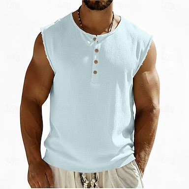 Herren Henley Hemd Weste Tanktop aus Leinen Ärmellos Henley Sommer Einfach Mode Designer Böhmische Knöpfe Rohkante Lässig Urlaub Ausgehen Weiß Rosa Marineblau Top T-Shirt für Herren