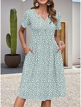 Damen Midikleid A Linie Kleid Lässig Täglich Normale Passform Blumen Kurzarm V Ausschnitt Hellgrün Rosa Sommer Frühling