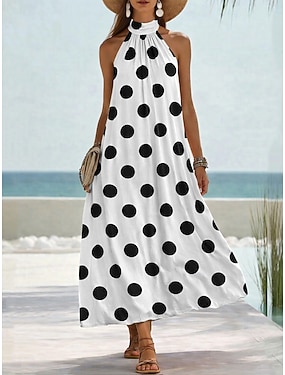 Damen Maxikleid Freizeitkleid Boho Chic Kleider Bohemien Urlaub Tropisch Strand Ferien Date Normale Passform Grafik Tupfen Böhmische Ärmellos Neckholder Schwarz und Weiß Weiß Gelb Hellgrün Sommer