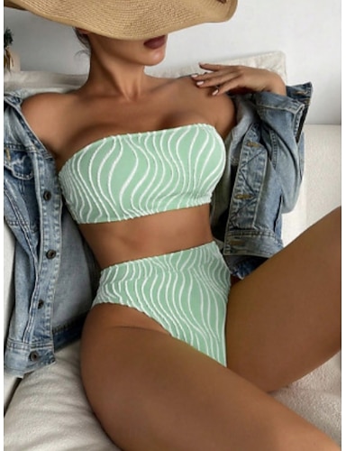Damen Badeanzug Bikini Zweiteilig Slips Bademode Schlank Rückenfrei Urlaub Strandbekleidung Gestreift Trägerlos Ärmellos Badeanzüge