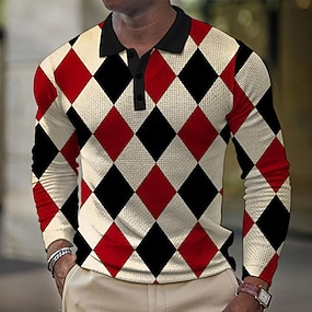 Herren Karomuster Waffel-Poloshirts Golfshirt Langarm Polo-Shirts Hemden mit Kragen Vintage Lässig Urlaubskleidung Formelle Kleidung Festivalkleidung Knöpfe 3D-Druck Frühling Herbst Winter Multi Color
