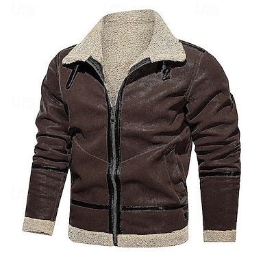 Herren Imitat-Lederjacke Winterjacke Sherpa-Jacke Urlaub Täglich Thermowarm Tasche Fleece Winter Farbblock Mode Streetwear Revers Regulär Khaki Kaffee Jacken