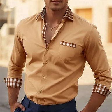 Herren Hemd Kleidhemd Knopfhemd Karomuster Täglich Geschäft Hellblau Weiß Hellgrün Orange Langarm Umlegekragen Ganzjahres Bekleidung Patchwork