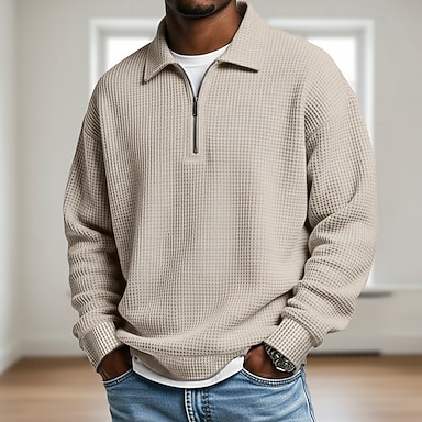 Herren Waffel-Poloshirts Textur Lässig Outdoor Reißverschluss Viertelreißverschluss Langarm Mode Modern Einfarbig Texture Gestrickt Frühling & Herbst Ganzjahres Bequeme Passform Schwarz Dunkelgrün