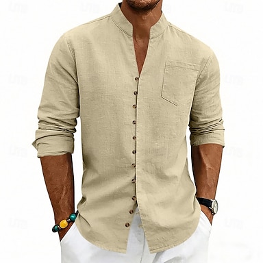 Herren Hemd Leinenhemd Popover-Hemd Sommerhemd Strandhemd Einfach Lässig Urlaub Schwarz Weiß Rosa Khaki Langarm Stehkragen Sommer Frühling Bekleidung Tasche