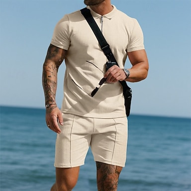 Männlich Waffel-Poloshirts T-Shirt Anzüge Trainingsanzug Shorts und T-Shirt-Set Kurzarm Rundhalsausschnitt Sommer Einfach Gymnastik Lässig 2 teilig Viertel Postleitzahl Lässig Urlaub Alltagskleidung