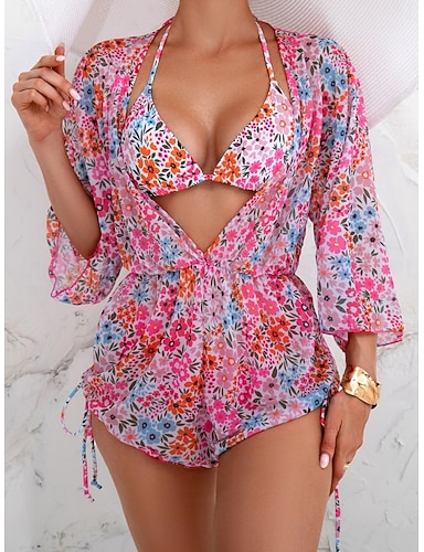 Damen Bikini 3-teiliger Badeanzug Cheeky Slim Rückenfrei Urlaubs Strandbekleidung Floraler V-Ausschnitt Ärmelloser Badeanzug