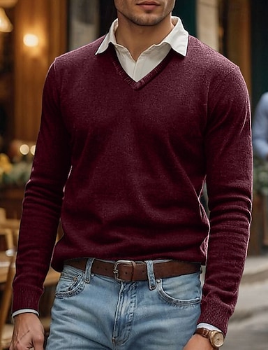 Herren Kleid Pullover Pullover Gerippt Stricken Normale Oberteile Strick Schmaler Schnitt Glatt V Ausschnitt Moderne zeitgenössische Weihnachten Arbeit Bekleidung Winter Wein Schwarz S M L