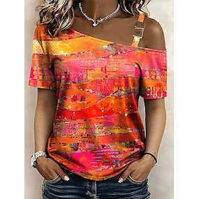 Damen T Shirt T-Shirt Druck Asymmetrisch Grafik Abstrakt Vintage Mode Stilvoll Kurzarm Ein-Schulter Schulterfrei Normale Oberteile Täglich Ausgehen Wochenende Blau Weiß Orange Sommer Frühling