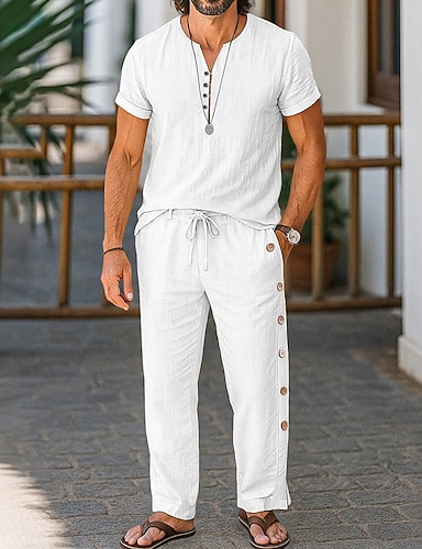 Herren Hemd Leinenhemd Sommerhemd Strandhemd Einfarbig Urlaub Kreuzfahrt Schwarz Weiß Kurzarm Rundhals Sommer Frühling Bekleidung
