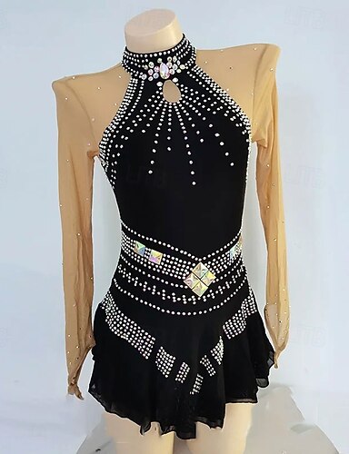 Eiskunstlaufkleid Damen Mädchen Eislaufen Kleid Schwarz Patchwork Netzstoff Hohe Elastizität Training Wettbewerb Eiskunstlaufkleidung Klassisch Kristall / Strass Langarm Eislaufen Eiskundstlauf