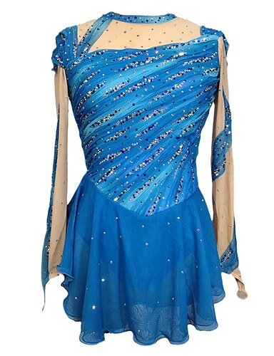 Eiskunstlaufkleid Damen Mädchen Eislaufen Kleid Blau Daumenloch Asymmetrischer Saum Netzstoff Hohe Elastizität Training Wettbewerb Eiskunstlaufkleidung Klassisch Kristall / Strass Langarm Eislaufen