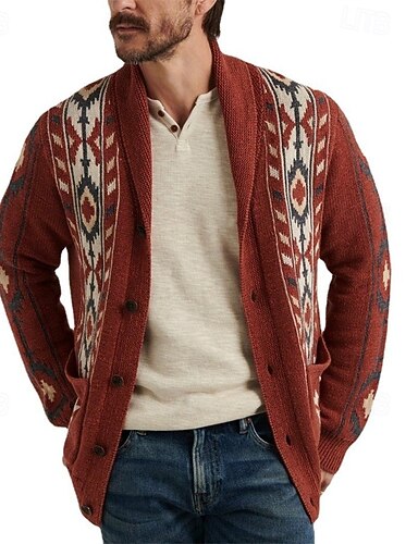 Herren Pullover Strickjacke Gerippt Stricken Normale Oberteile Knopf hoch Geometrisch Schalkragen Urlaub Mode Lässig Alltagskleidung Bekleidung Winter Kaki M L XL