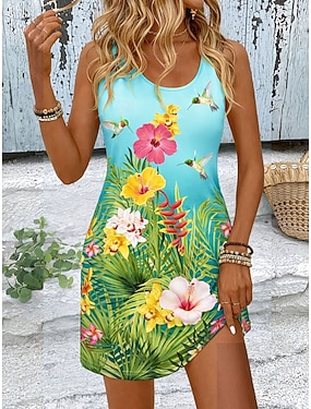 Damen Minikleid Sommerkleid A Linie Kleid Schulterfreies Kleid Urlaub Lässig Ferien Strand Normale Passform Blumen Grafik Vogel Ärmellos Rundhalsausschnitt Magenta Rosa Purpur Orange Sommer