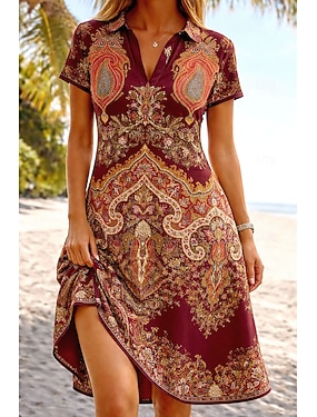 Damen Knielanges Kleid A Linie Kleid Urlaub Lässig Boho Strand Normale Passform Grafik Paisley-Muster Boho Paisley Damast Kurzarm V Ausschnitt Rote Sommer Frühling