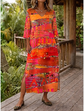 Damen Maxikleid Boho-Kleid Shiftkleid Sommerkleid Strandkleid Bohemien Urlaub Ethnisch Strand Ferien Date Normale Passform Grafik Abstrakt Dreiviertelarm V Ausschnitt Orange Sommer Frühling
