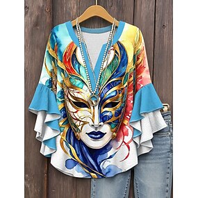 Karnival Damen Bluse Druck Grafik Abstrakt Vintage Täglich Stilvoll Dreiviertelarm V Ausschnitt Normale Oberteile Täglich Ferien Urlaubskleidung Blau Sommer Frühling Herbst