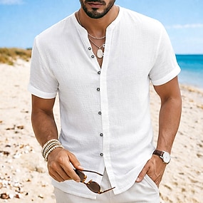 Herren Hemd Leinenhemd Popover-Hemd Sommerhemd Strandbekleidung Stehkragenhemd Einfach Urlaub Kreuzfahrt Schwarz Weiß Rosa Grün Kurzarm Henley Sommer Bekleidung