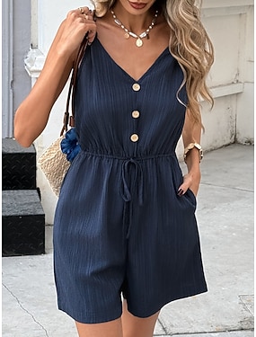 Damen Normal Strampler Aktiv Einfarbig Ärmellos V Ausschnitt Tasche Knöpfe Täglich Urlaub Normale Passform Marineblau Sommer