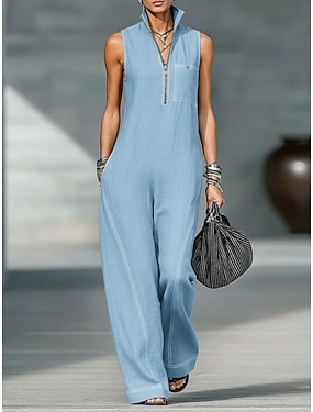 Damen Normal Overall Aktiv Einfarbig Ärmellos Weites Bein Hemdkragen Reißverschluss Tasche Täglich Urlaub Lässiger Schnitt Blau Schwarz Gelb Sommer