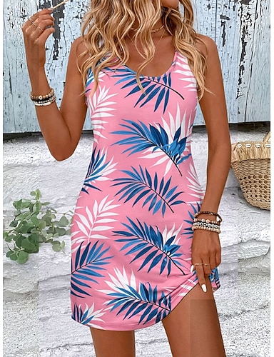 Damen Minikleid Sommerkleid A Linie Kleid Urlaub Lässig Boho Strand Party Hochzeit Figurbetontes Kleid Grafik Blatt Ärmellos U-Ausschnitt Blau Rosa Purpur Orange Sommer Frühling