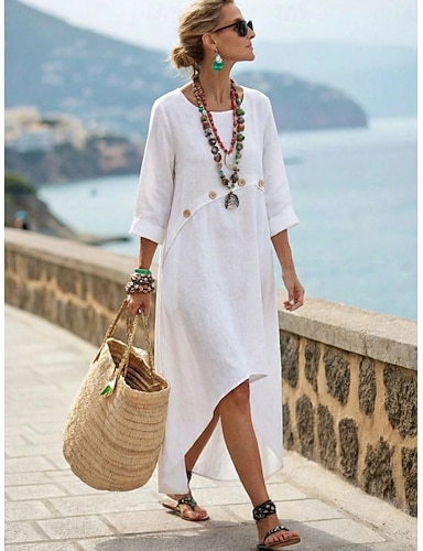 Damen Maxikleid Kunstbaumwollleinen Shiftkleid Kaftan Kleid Weißes Kleid Basic Lässig Täglich Ferien Lässiger Schnitt Einfarbig Dreiviertelarm U-Boot-Ausschnitt Weiß Rote Grün Leicht Blau Sommer