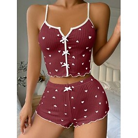 Damen Schlafanzug Set Lässig Komfort Herz Elastischer Bund Trägertop Shorts Heim Täglich Ärmellos V Ausschnitt Schwarz Weiß Rosa Wein Rote Sommer Frühling Herbst Schmale Passform