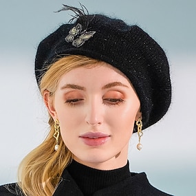 Hüte, 100 % Wolle, künstliche Feder, Baskenmütze, Schlapphut, Party/Abend, lässige Dame, Hochzeit, mit Feder, Schmetterling, Kopfschmuck, Kopfbedeckung