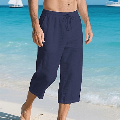 Herren Caprihose Leinenshorts Sommershorts Strandshorts Tasche Kordelzug Elastischer Bund Einfach Komfort Atmungsaktiv Wadenlang Urlaub Ferien Strand Hawaiianisch Boho Schwarz Weiß Mikroelastisch
