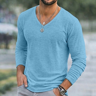 Herren-Leinen-T-Shirt, langärmelig, V-Ausschnitt, Sommer/Frühling &Sommerliches, einfarbiges, schlichtes Alltags-T-Shirt im Streetstyle, hellblau, seeblau, schwarz, für Herren