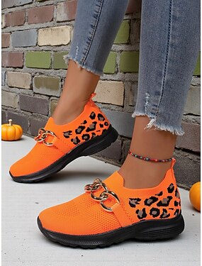orangefarbene Flyknit-Slip-On-Sneaker für Damen mit Leopardenmuster und Kettendetail – trendige Schuhe mit dicker Sohle für Halloween, Festivals und Streetwear
