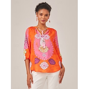 Damen T Shirt Grafik Geometrisch Abstrakt Vintage Stilvoll Modern Langarm Einkerbiger Ausschnitt Normale Oberteile Täglich Wochenende Druck Rosa Wein Rote Blau Orange Frühling Herbst