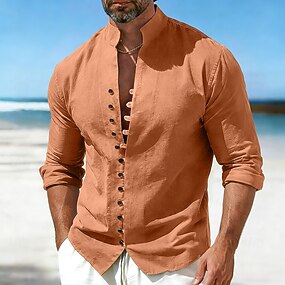 Herren Hemd Leinenhemd Sommerhemd Strandbekleidung Freizeithemd Knopfhemd Einfach Urlaub Täglich Schwarz Weiß Rosa Blau Langarm Stehkragen Sommer Frühling & Herbst Bekleidung
