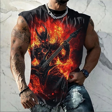 Herren-Tanktop mit Dämonenmotiv, Gitarre spielend, grünes Feuer, Flammen, Heavy Metal, Gothic Rock, Punk, Dark Fantasy, ärmellos, Allover-Print, Rundhalsausschnitt, figurbetont, Streetwear, Konzert-