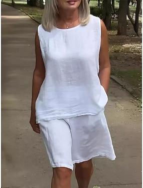 Damen Zweiteilige Sets Bluse Kunstbaumwollleinen Baggy-Shorts Ärmellos Rundhalsausschnitt Einfach Patchwork Mode Streetwear Täglich Lässig Täglich Weiß Khaki Sommer Normale Passform