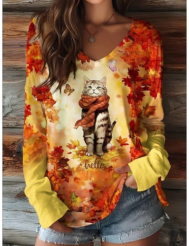 Ostern Damen T Shirt Druck Blumen Grafik Katze Vintage Stilvoll Klassisch Langarm V Ausschnitt Normale Oberteile Täglich Schwarz Gelb Orange Sommer Frühling Herbst