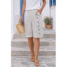 Damen Caprihose Kunstbaumwollleinen Shorts Sommershorts Alltagstauglich Knielang Gestreift Seitentaschen Atmungsaktivität Bequem Unelastisch Ausgehen Wochenende Beige Sommer Normale Passform