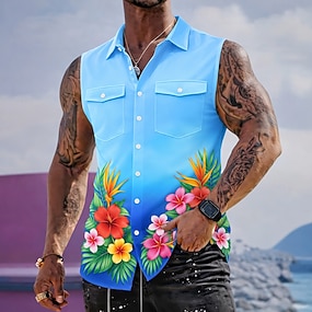 Herren Blumendruck Tropische Blumen Farbverlauf Hemd Sommer Hawaiihemd Alohahemd Ärmellos Resort Strandurlaub Sommer Frühling Umlegekragen 3D-Druck Zwei Fronttaschen Hemden mit Knopfleiste Blau Rosa