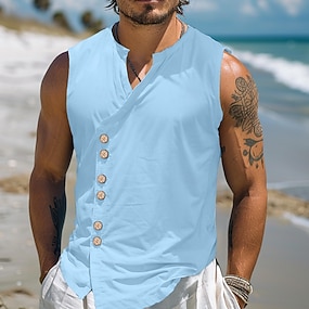 Herren Hemd Leinenhemd Sommerhemd Strandhemd Vintage-Shirt Ärmelloses Shirt Einfach Lässig Täglich Schwarz Weiß Himmelblau Khaki Ärmellos Mandarinkragen Sommer Frühling Bekleidung Knöpfe