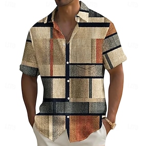 Herren Geometrisch Karo / Karomuster Hemd Sommerhemd Knopfhemd Kurzarm Modisch lässig Streetwear Urlaub Ferien Sommer Umlegekragen 3D-Druck Eine Tasche vorne Leinenähnliches Hemd Gelb Grün Grau