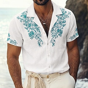 Herren Geometrisch Blumendruck Blumen Hemd Guayabera Hemd Knopfhemd Kurzarm Modisch lässig Urlaub Alltagskleidung Strandbekleidung Sommer Frühling Umlegekragen Hemden mit Kragen Weiß Blau