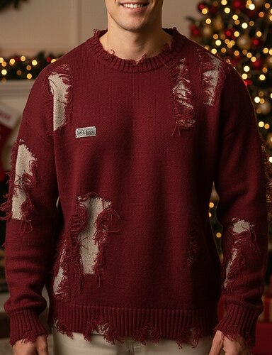 Herren Weihnachtspullover Pullover Distressed Sweater Strickpullover Gerippt Stricken Normale Oberteile Gestrickt Farbblock Rundhalsausschnitt Vintage Mode Weihnachten Urlaub Bekleidung Herbst Winter